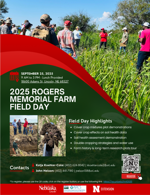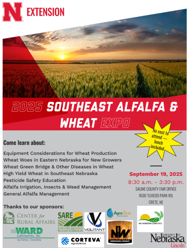 Alfalfa and Wheat Expo: Nebraska Extension is hosting the 2025 Southeast Nebraska Alfalfa & Wheat Expo on Friday, Sept. 19, from 8:30 a.m. to 3:30 p.m. at the Saline County Fairgrounds Office (1600 Tuxedo Park Rd., Crete). This one-day event is designed for wheat and alfalfa producers to gain practical insights, connect with experts, and sharpen their management strategies. Topics include: Equipment considerations for wheat production; Wheat disease updates and management strategies; Insights on achieving high-yield wheat in southeast Nebraska; Alfalfa irrigation, insects, weeds, and crop health management; Pesticide safety updates; Sponsor exhibits, networking, and raffle prizes. Come for the whole day or stop in for the sessions that fit your schedule. Register online at https://go.unl.edu/2025-alfalfa-wheat-expo or call the Saline County Extension office at 402-821-2151.