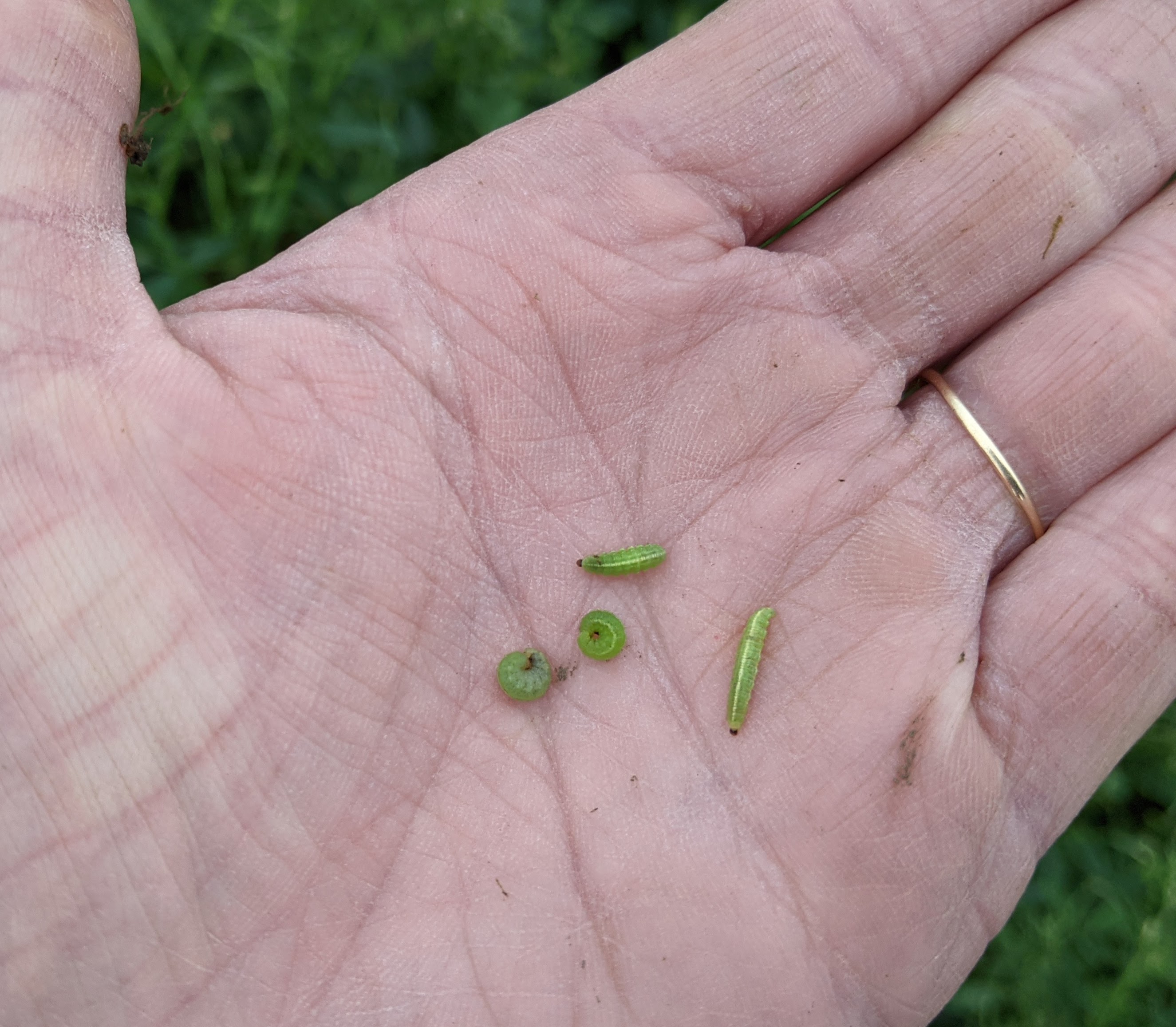 Alfalfa weevils have been heavy this year. For those with alfalfa, you may have noticed the tops of your plants turning a grayish/brown color. The culprit is most likely alfalfa weevil larvae. They are green caterpillars with a white stripe down the back and dark head. They are often hard to find as they will go down to the crowns of plants in heat of day. By the time you read this, the alfalfa will most likely be put down. What you may observe: once the alfalfa is put down, the weevil larvae will continue to feed. The area under the windrows will turn brown as they feed on the regrowth. As soon as the alfalfa is baled, we’d recommend using an insecticide to kill the larvae and allow the alfalfa to regrow. I’m still seeing all stages of larvae in the field. Highly effective insecticides for alfalfa weevil control include those that are pyrethroids (active ingredient ends in “thrin”, such as Permethrin) and products containing indoxacarb (e.g., Steward). Each field situation may be different, though, so watch the regrowth. If it’s greening up and you’re not finding weevil larvae, they may have pupated and treatment may not be necessary.