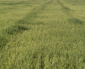 tracks showing green wheat in the wheel tracks and yellow wheat elsewhere-most likely the compaction from wheels allowed for better establishment, created a depression where moisture held, and allowed for less nitrogen loss.