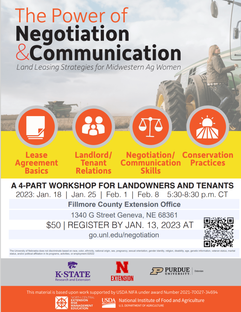 The Power of Negotiation and Communication is provided via Women in Ag focusing on women, but men are welcome to attend. It is a 4-part workshop held Jan. 18, Jan. 25, Feb. 1 and Feb. 8 from 5:30-8:30 p.m. Topics include: Lease Agreement Basics; Landlord/Tenant Relations; Negotiation/ Communication Skills; and Conservation Practices. Locations hosting include: Ext. Office in Geneva, Fairgrounds in Central City, and Ext. Office in Lexington. More info: go.unl.edu/negotiation.