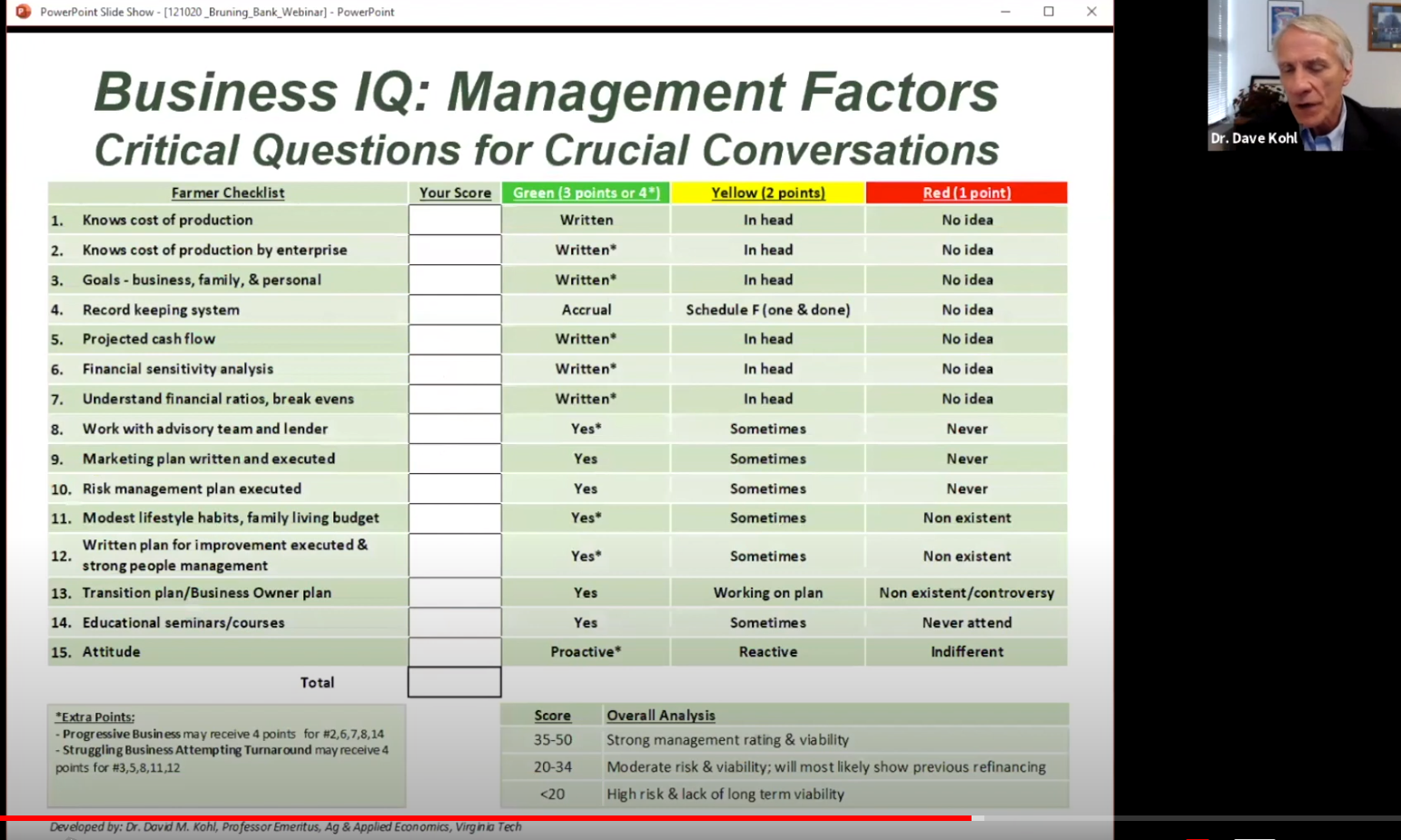 Kohl reminded participants of his business IQ exercise that ANY business should undertake. The areas in the business IQ included cost of production knowledge, cost of production by enterprise, goals (business, family, personal), record keeping system, projected cash flow, financial sensitivity analysis, financial ratio/break evens, those who work with an advisory team/lender, those whom have a marketing plan and execute, those whom have a risk management plan and execute, modest lifestyle habits, strong people management plan, transition plan, those whom attend educational seminars, and their attitude.