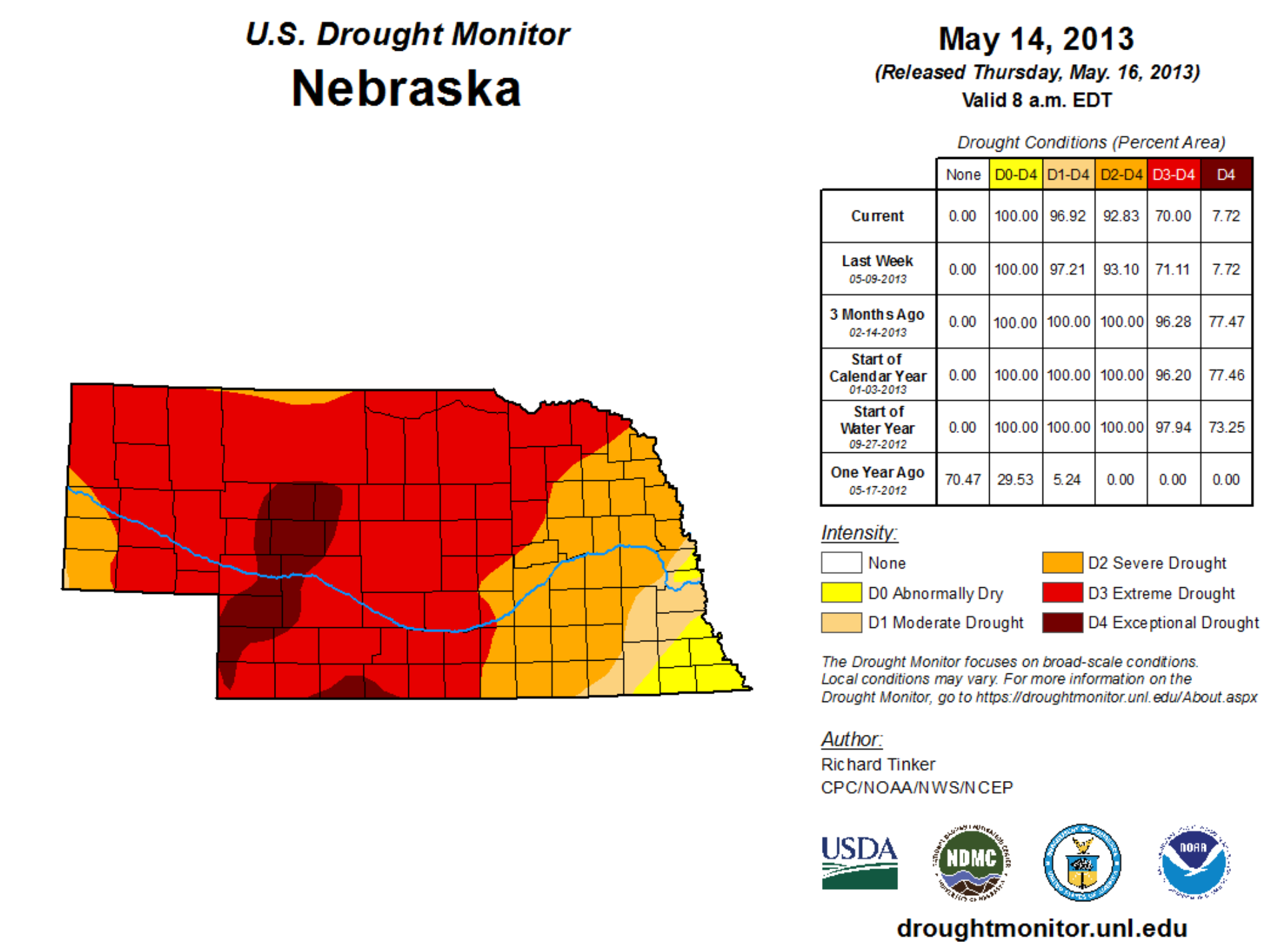We went into 2012 with subsoil moisture in this part of the State, and I remember the dry surface conditions led to good planting weather and the spring-flowering plants were early. The Spring of 2013 lacked a full soil profile compared to the Spring of 2012 (similar to Spring 2023 to 2022). To visualize this, I pulled up images from the Drought Monitor. The May 15, 2012 map showed only 5.2% of the State was in D1-D4 drought (and technically, nothing was over D1, which is considered ‘moderate drought’). In contrast, one year later, the May 14, 2013 map showed 96.9% of the State was in D1-D4 drought. I also pulled up the May 9, 2023 drought monitor map. It shows 98.99%…so essentially 99% of the State is in D1-D4 drought. The 2013 map technically shows the drought was worse this time of year for the majority of the State, particularly western NE. 2023 shows the eastern part of NE suffering more than it did in 2013.
