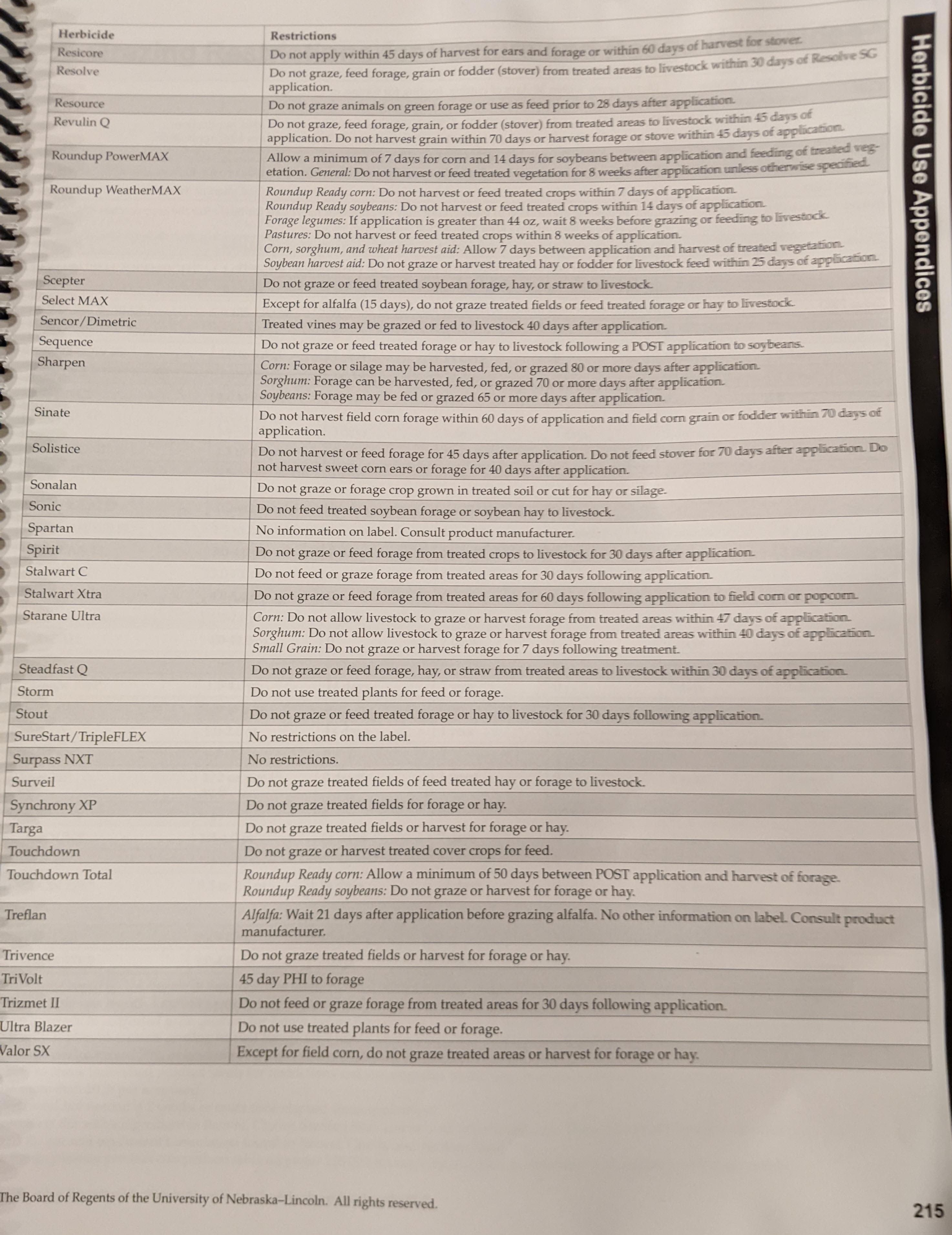 For non-irrigated crops, forage has been on my mind all year. Thus, why I wasn’t recommending full chem loads and side-dress nitrogen applications depending on the individual field situations. My thought has been these non-irrigated crops become opportunities for grazing where that’s applicable. There’s considerations first such as being released by crop insurance, waiting till the crops have died as today’s hybrids and varieties are more resilient than the past, and checking herbicide grazing restrictions (I have pics of those from the UNL Weed Guide on my blog). I’ve been talking to a lot of people about how to graze corn and soybeans or other options and will share in future weeks if we need to go there.