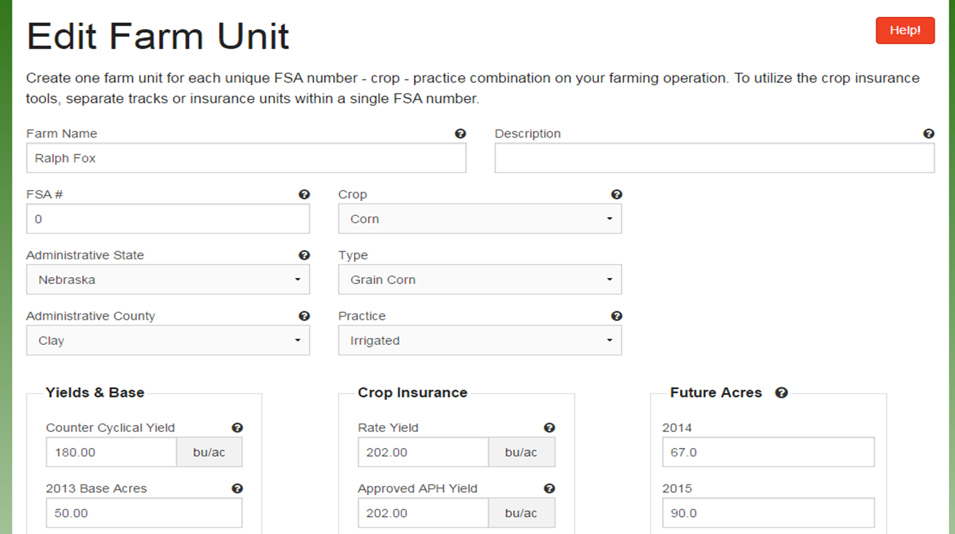 Notice that each crop needs to be added as a separate farm unit. If using the crop insurance tool, each crop insurance tract under each FSA farm number needs to be added as a separate farm unit. Be sure to split out base acres among the tracts and be sure that the total base acres add up to the total base acres from FSA.