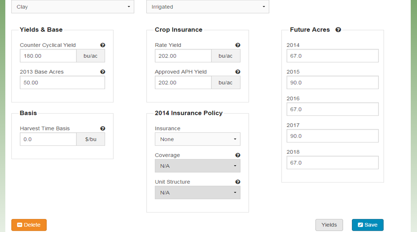 Some are having a difficult time finding “rate yield” on their crop insurance forms. It is not critical if you are not using the crop insurance tool and the same Approved APH yield can be inputted for the rate yield as well. If using the crop insurance tool, the correct rate yield from crop insurance must be used. UPDATE: If you ARE NOT interested in analyzing crop insurance information, “0” can be inserted for basis price, rate and APH yields, and select “none” for crop insurance. If you are also not interested in analyzing ARC-IC, then “future acres” can also be entered as “0”.