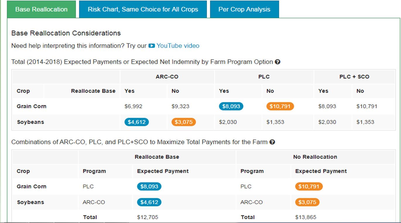 In this example, you notice three tabs: Base reallocation, risk chart, and per crop analysis. The green tab shows what you are looking at-in this case base reallocation. Notice there are two charts: The top one shows ARC-Co, PLC, and PLC+SCO. Blue circles indicate best option with reallocating base acres while orange circles indicate best option without reallocating base acres. The second table gives you your totals. Notice in this table and the one above that PLC+SCO are shown as the best options for corn. However, in the total, because we did not separate the crop insurance tracts in this FSA farm number and because I didn’t include 10 years of yield data, I need to recalculate the totals by looking at the top table for the next highest prices under ARC and PLC. So for this example, to refigure best reallocation of base payment total, I would take the $8093 listed in PLC, reallocation for corn since it is higher than ARC and add it to the $4612 for soybean payment to get: $12,705 for base reallocation. For no base reallocation, I would add $10,791 from PLC since higher than ARC in this example and add it to $3075 to get a total of $13,866 for no base reallocation. Most of the time, the outcome stays the same, but there are a couple instances it has changed, so wanted to make you aware of the importance of this.