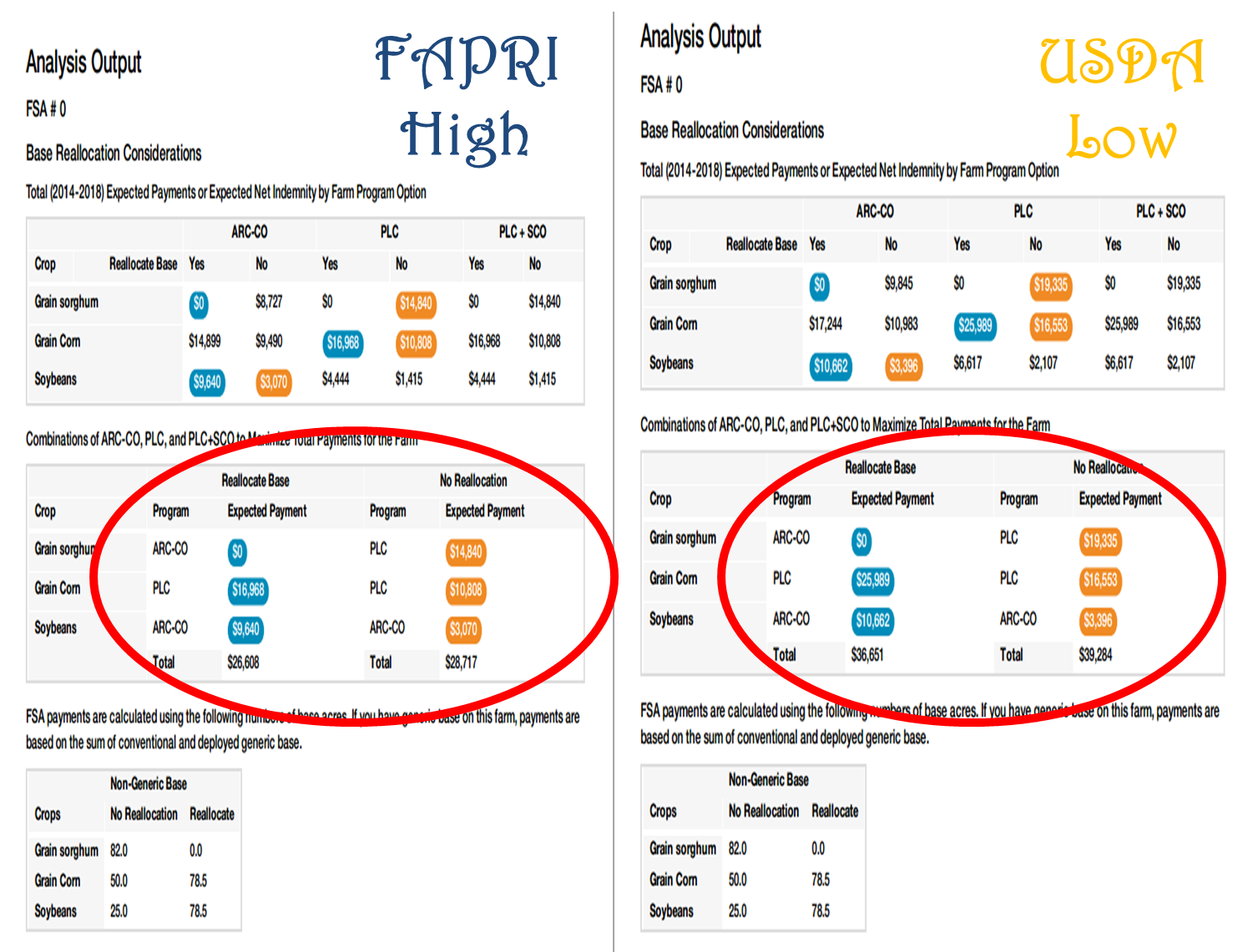 Once I print both sets of prices, the gals in my office and I staple together each farm number. We write “high” for FAPRI prices and “low” for USDA prices. I then place the High and Low together by farm number and farm by farm, go through the output with the farmers. Ultimately, I’m looking for trends when both the higher and lower prices agree. In this example, we are first looking at the base acre reallocation decision. Blue bubbles mean higher payments with reallocation; orange means higher payments without reallocation. Look at the bottom line for total payments. Notice in this example that for both low and higher prices, not reallocating the base is consistently higher. To help explain this, look at the base acre information below. What is occurring for this particular farm is a loss of grain base from 132 to 78.5 grain base acres. So essentially for this farm, the increase in corn base acres was not enough to off-set the milo payment from old base. The farmer then has to choose if he/she wants to reallocate base to what is currently planted, or retain base acres to protect grain base and obtain the milo payment. The other thing to notice is the decision of ARC-Co or PLC for each crop and how well they match between high and low prices. In this case, if the farmer chooses no reallocation, PLC is most consistent for milo and corn while ARC-Co is most consistent for soybeans. When both high and lower prices agree like this, it helps make decisions easier. You can always go back and play with the prices more, but you have to be careful with that. Remember, your decision ultimately is based on what you feel future prices will be for the next five years.