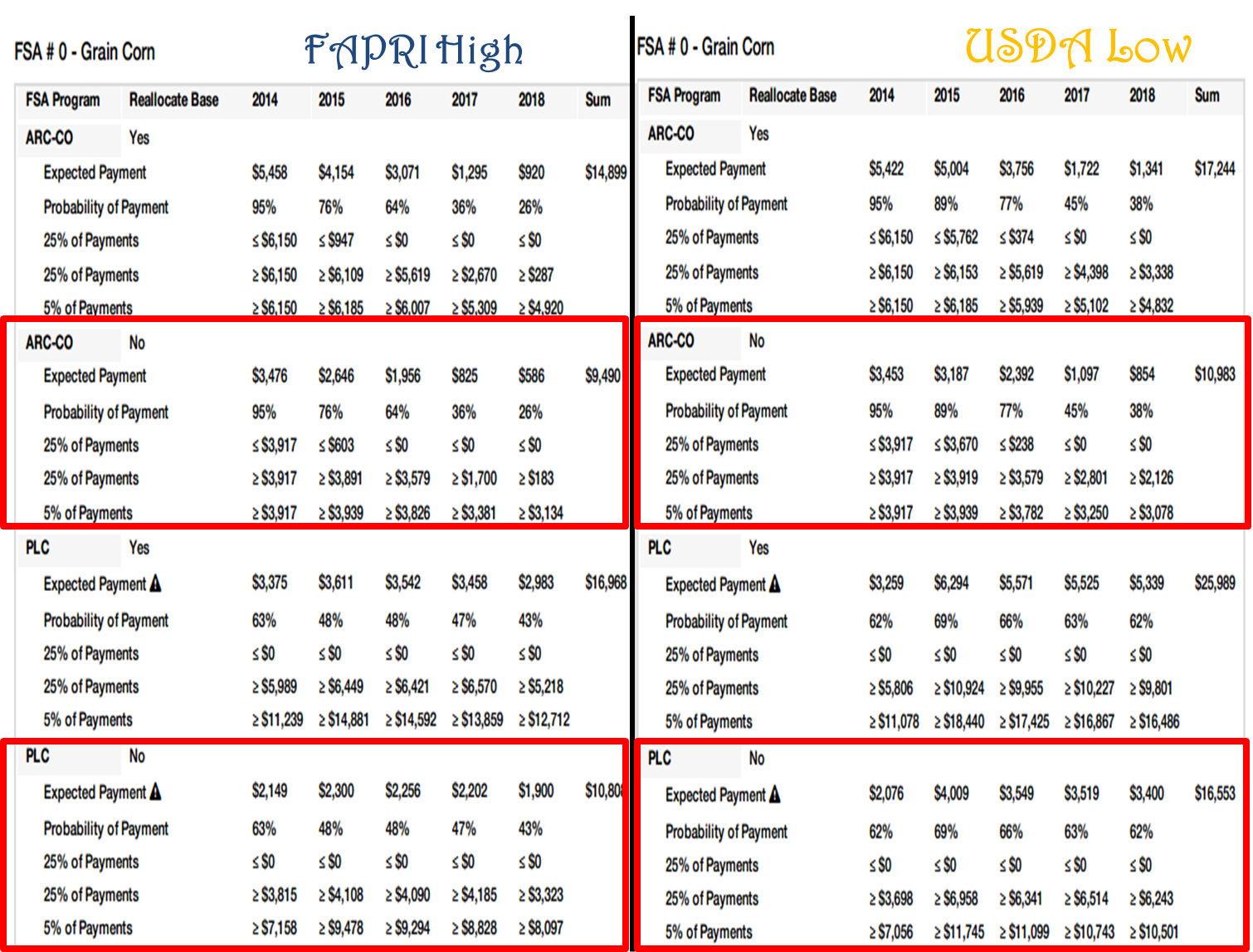 The final thing I like to do is analyze the output for higher and lower prices crop by crop, especially for farms where Corn switches decisions on the first page from ARC-Co with FAPRI prices to PLC with USDA prices. It comes down to what the producer feels prices will be the next 5 years. I compare the ARC-Co vs. PLC prices for whichever decision the farmer makes regarding base reallocation. In this example, let’s say the farmer decides to not reallocate his/her acres. We then compare ARC-Co vs. PLC for both FAPRI and USDA prices for each crop. Besides the total payment over the length of the farm bill based on these prices, I also like to compare payments year by year with both options and look at probabilities of those payments based on the projected FAPRI and USDA prices. In this situation, PLC provides higher payments in both higher and lower price situations over the life of the farm bill. ARC-Co provides slightly larger payments the first one or two years depending on price. One thing to keep in mind: If FAPRI prices are correct, then the PLC payments for years 2015-2018 go to $0 because FAPRI is estimating prices above the $3.70 trigger price for corn. So why does the tool show a PLC payment for FAPRI prices? It is taking into account 500 scenarios at one time that all have a chance of occurring in the future and the probability of payment if prices are at, above, or below the predicted FAPRI price for each year. Same for USDA prices. So it’s important to always keep this in mind when analyzing the results.