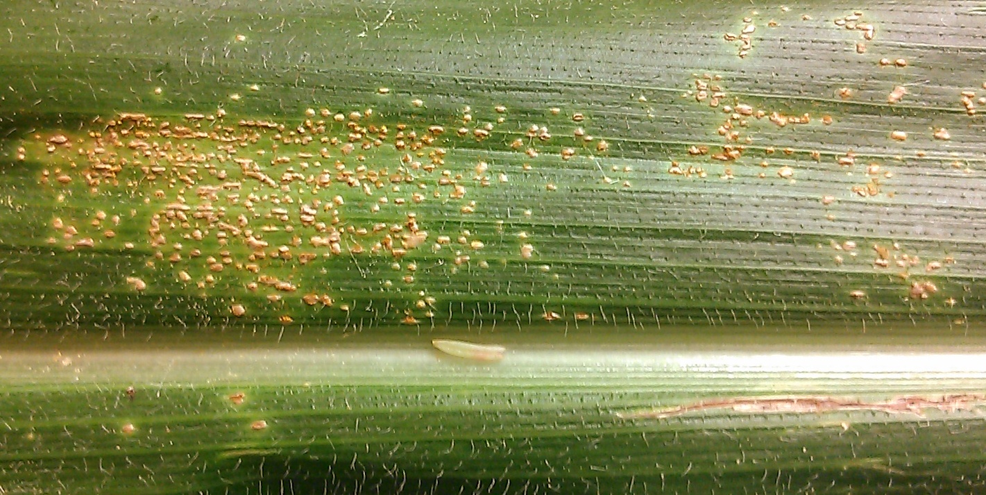 For southern rust, we’re seeing very small, raised, tan-orange pustules on the upper leaf surface of leaves in localized areas on mid-upper leaves. These pustules are tightly clustered on the leaves.