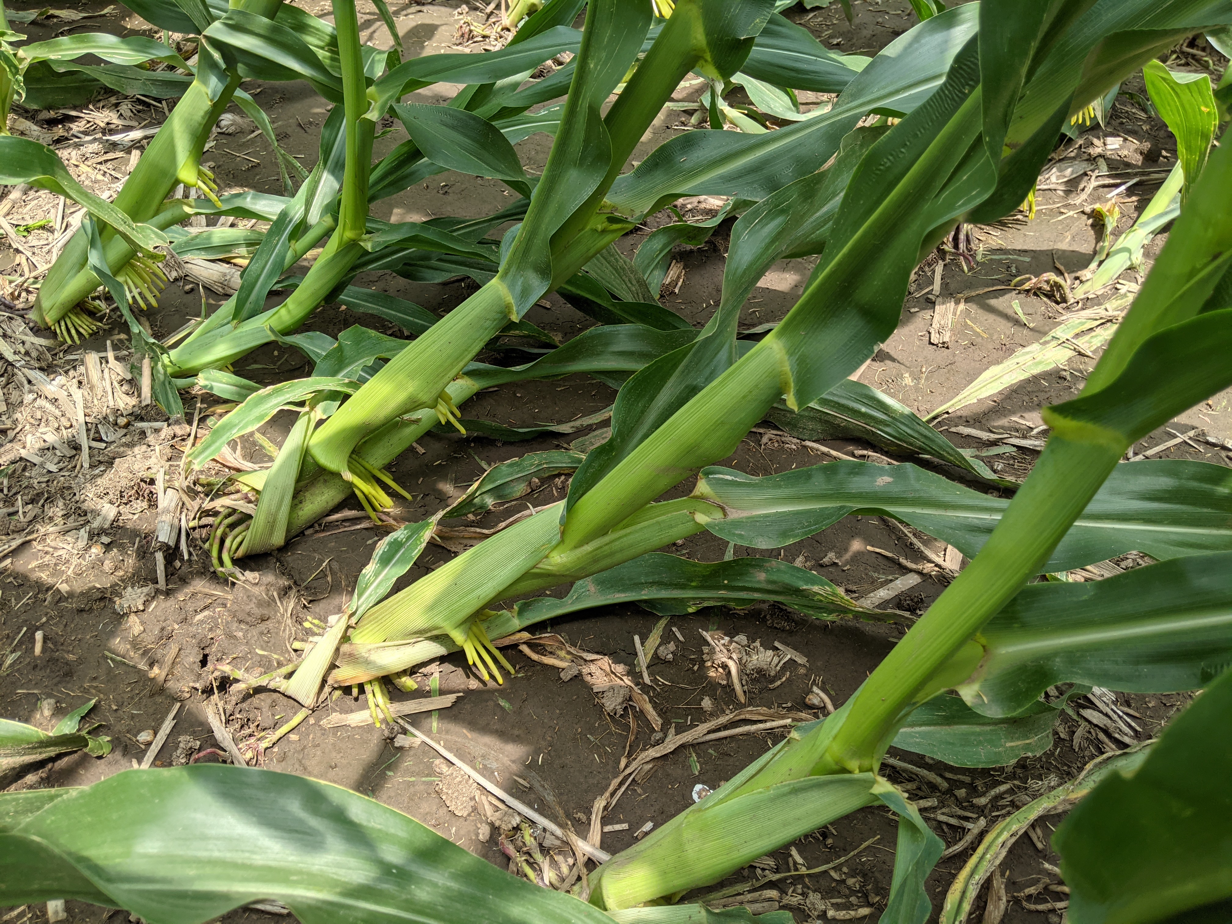 Severely greensnapped field of later-planted corn.