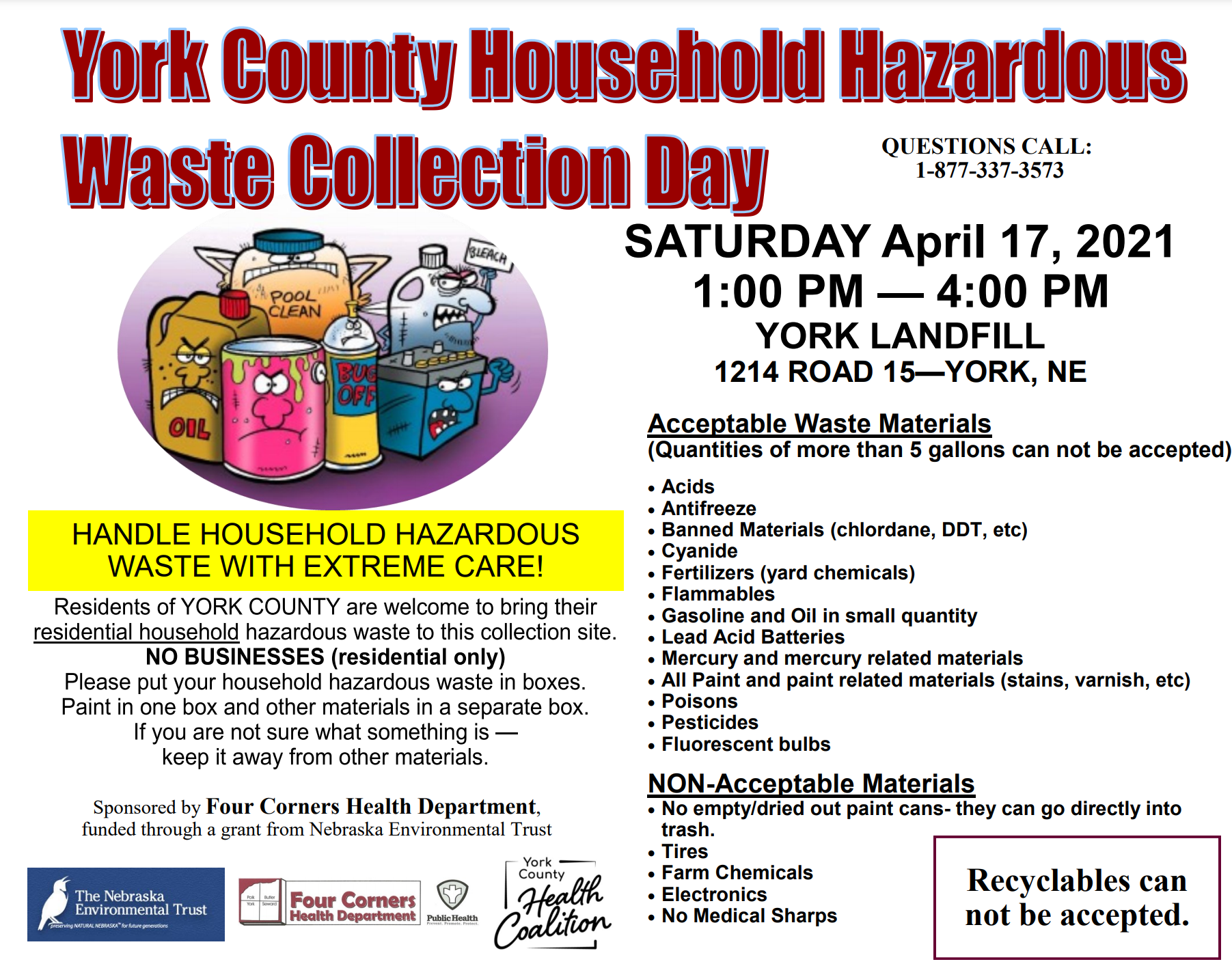 Household Hazardous Waste Clean-Up will be held at four times and locations for residents of Polk, York, Butler, and Seward counties. These clean-ups are funded by Environmental Trust grants with Four Corners Health Dept. and various sponsoring organizations overseeing the collection at the locations.