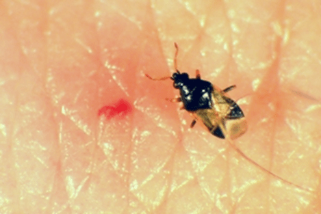 food before winter to cause a painful bite on humans. I’ve received several questions about “what is that tiny black bug with white marks on back that bites?” The insect, known as the minute pirate bug (and insidious flower bug), is actually a beneficial predator of thrips, mites, aphids, tiny caterpillars, and insect eggs. People will even purchase these insects for biological control, particularly in greenhouse settings. They’re found throughout crop, garden, landscapes, and wooded areas in the summer preying on other insects. However, this time of year they start biting humans they land on. One doesn’t need to worry about them injecting a venom, feeding on blood or transmitting disease. People’s reactions to the bites range from no reaction to swelling like a mosquito bite. Unfortunately there’s also no method of controlling them. Insect repellents don’t work as they aren’t attracted to carbon dioxide like mosquitoes are. They are attracted to light colored clothing, so wearing darker colors and long sleeves can help when being outdoors during warm, sunny days. Otherwise, work outdoors on cool, cloudy days.