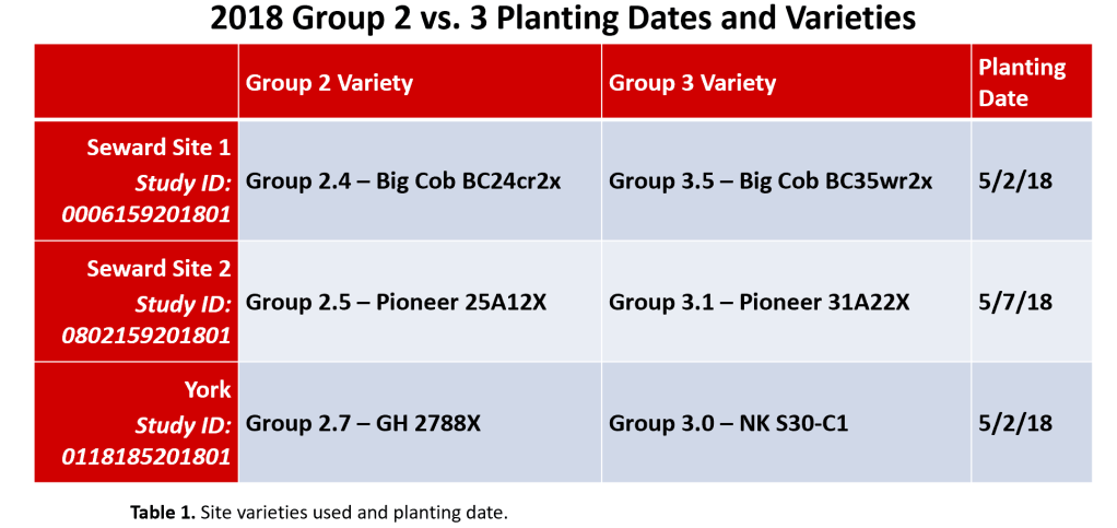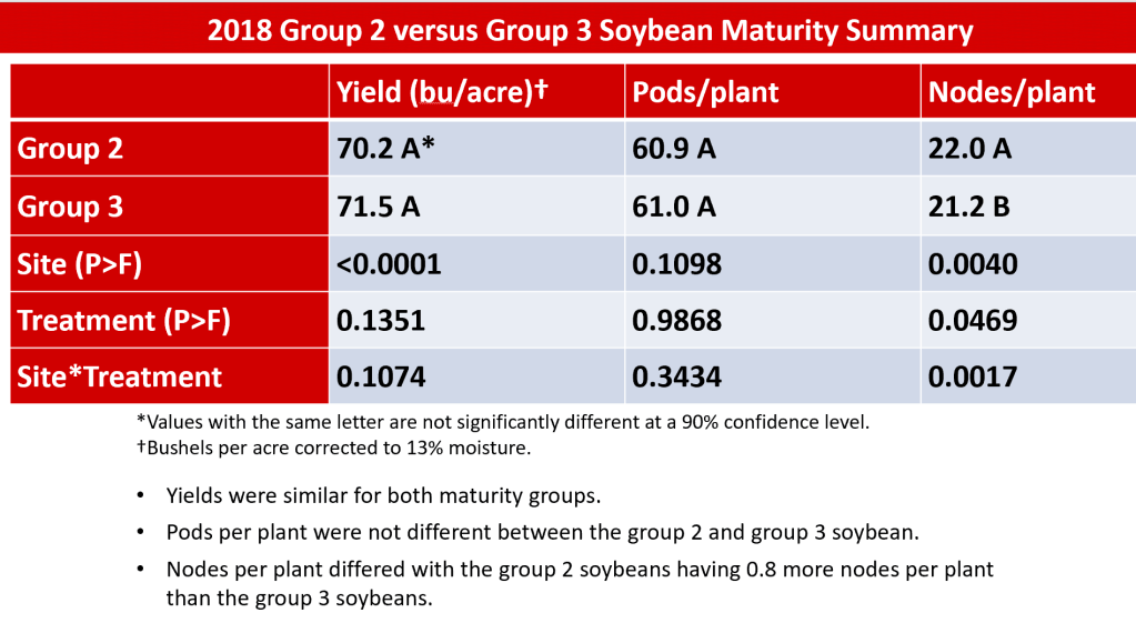 Happy March! One question that’s surfaced often is ‘at what maturity of corn and soybean do we start losing yield?’ There are many reasons for this question including planting a range of maturities to spread harvest load, taking advantage of marketing opportunities, and even planting shorter maturities to allow for increased cover crop biomass after harvest. The past two years, on-farm research growers in York and Seward Counties have compared Group 2 vs. Group 3 beans planted early to determine any yield differences. In 2018, combining the data from 16 reps over 3 locations planted the first week of May, the Group 2 and Group 3 beans yielded 70.2 bu/ac vs. 71.5 bu/ac respectively with no yield difference. In 2019, there were 13 reps over 3 locations. We don’t have these analyzed as a group. At the first (non-irrigated) location planted April 22, the 2.1 bean significantly out-yielded the 3.1 bean (70 bu/ac vs. 67 bu/ac). At the second (irrigated) location planted May 2, the 2.4 and 2.7 beans significantly out-yielded the 3.1 and 3.3 beans (71, 73, 70, and 67 bu/ac respectively). At the third (irrigated) location planted May 16, there was no difference between the 2.7 and 3.4 beans (71 vs. 72 bu/ac respectively).