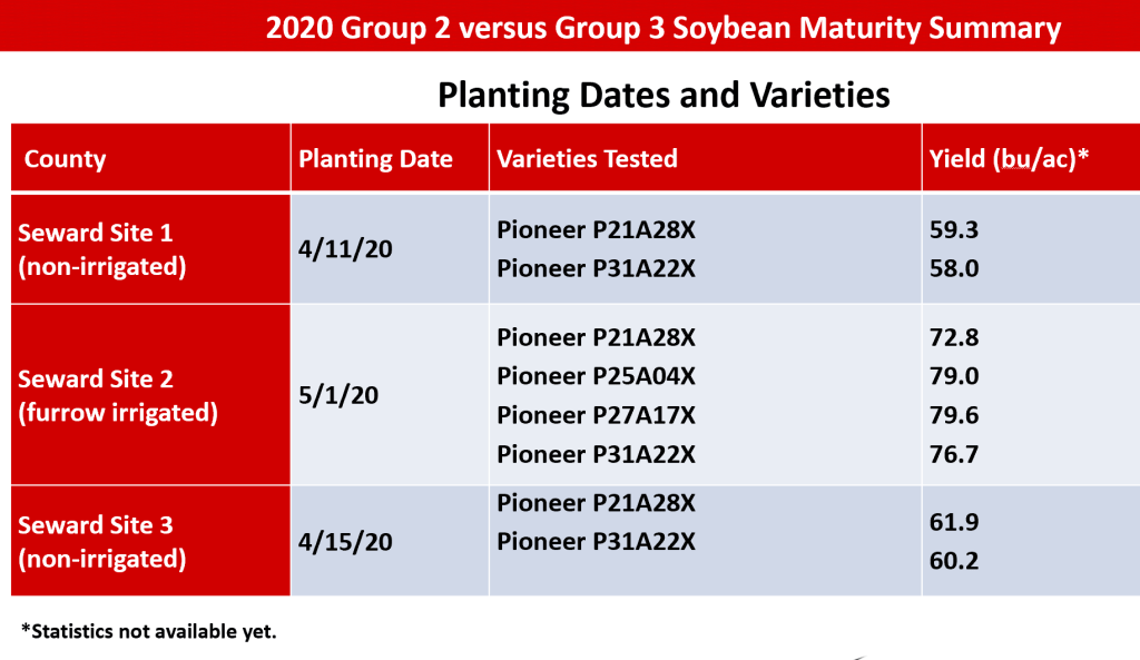 We now have 13 site-years worth of data from Seward and York counties comparing Group 2 and Group 3 maturity soybeans. Reasons for considering a Group 2 variety in our area include spreading out harvest, opportunity for planting cover crops for greater fall growth, and spreading risk from weather events. In 10 of the 13 site-years, there were no yield differences between high-yielding Group 2 and 3 varieties when planted mid-April to early May. In the other three site-years, the Group 3 varieties had higher yields than the Group 2 varieties. One reason was late season rains benefited Group 3 soybeans in non-irrigated environments in two site-years. In the gravity irrigated ridge-till environment, harvesting the Group 2 variety sooner may have helped reduce plants from lodging down into furrows that are difficult to pick up at harvest.