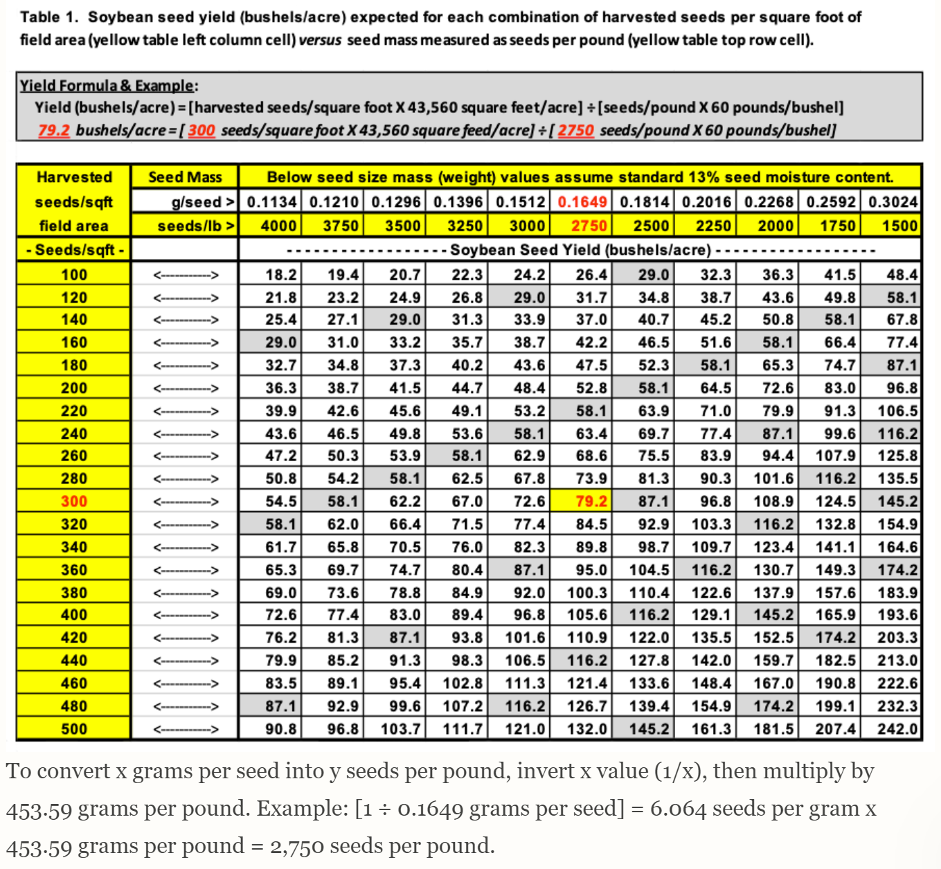 In 2023, Alex Harrell reported a record soybean yield of 206.8 bushels/acre in 2023, and he suggested that the harvested seed in field likely had a seed mass of around 1,675 seeds/pound. Thus, a large seed size with (doing the math) around 477 seeds per square foot on a plant population of 77,000 plants/ac.