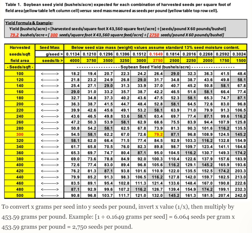 Looking at the above chart, Alex Harrell from Georgia who reported a record soybean yield of 206.8 bushels/acre in 2023 suggested that the harvested seed in field likely had a seed mass of around 1,675 seeds/pound. Thus, a large seed size with (doing the math) around 477 seeds per square foot on a plant population of 77,000 plants/ac.