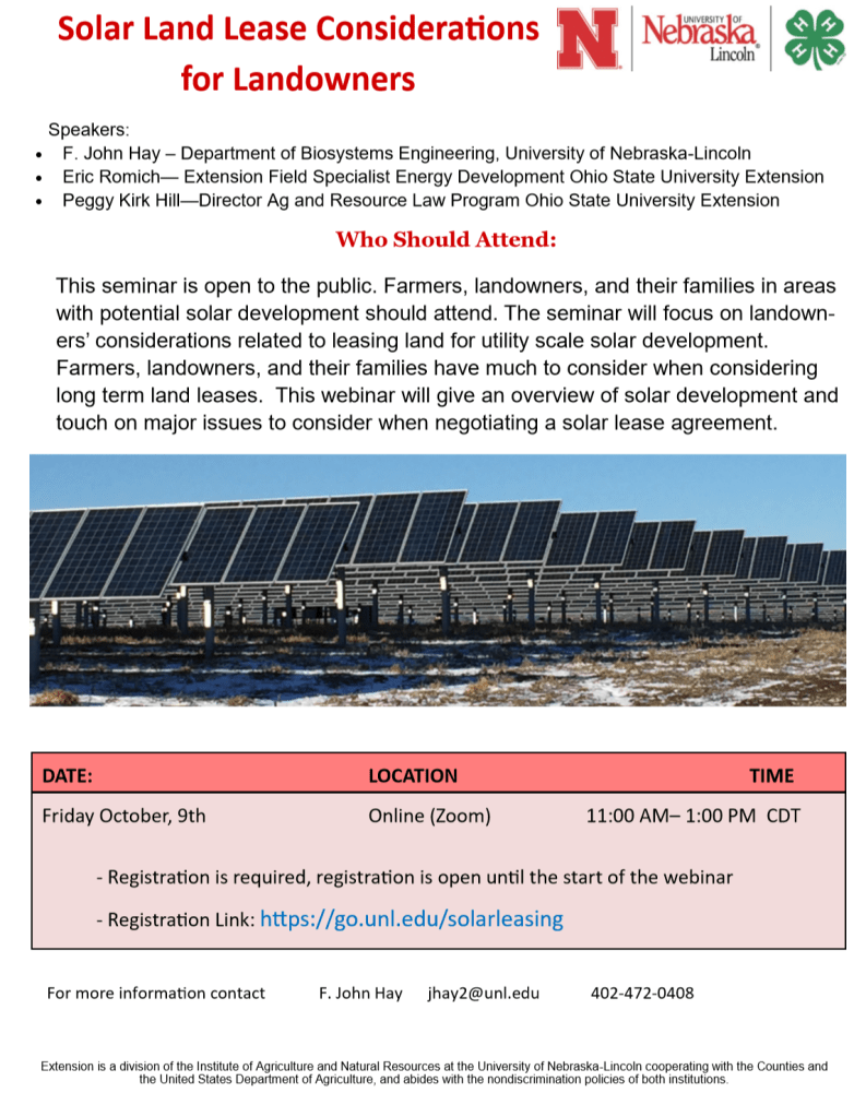 Land Leasing for Solar Development Oct. 9th: Just a reminder of this virtual seminar to be held October 9th from 11 a.m. to 1 p.m. You can register at https://go.unl.edu/solarleasing. This seminar is open to the public. Farmers, landowners, and their families in areas with potential solar development have much to consider and should consider attending. This webinar will give an overview of solar development and touch on major issues to consider when negotiating a solar lease agreement. More info. on this topic at: https://cropwatch.unl.edu/2020/considerations-leasing-land-solar-development.