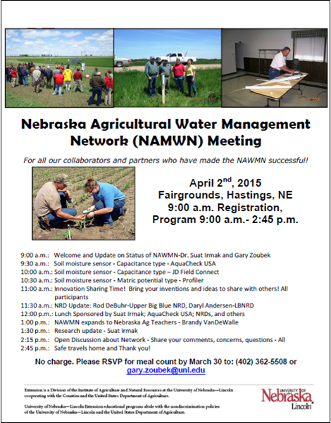 April 2, 2015 is the date for the 2nd annual Nebraska Ag Water Management Network (NAWMN) Meeting! Come hear the latest in irrigation research and share with your peers during the innovation sharing and Q/A discussions. There’s no charge but please RSVP to Gary Zoubek at (402) 362-5508 or gary.zoubek@unl.edu.